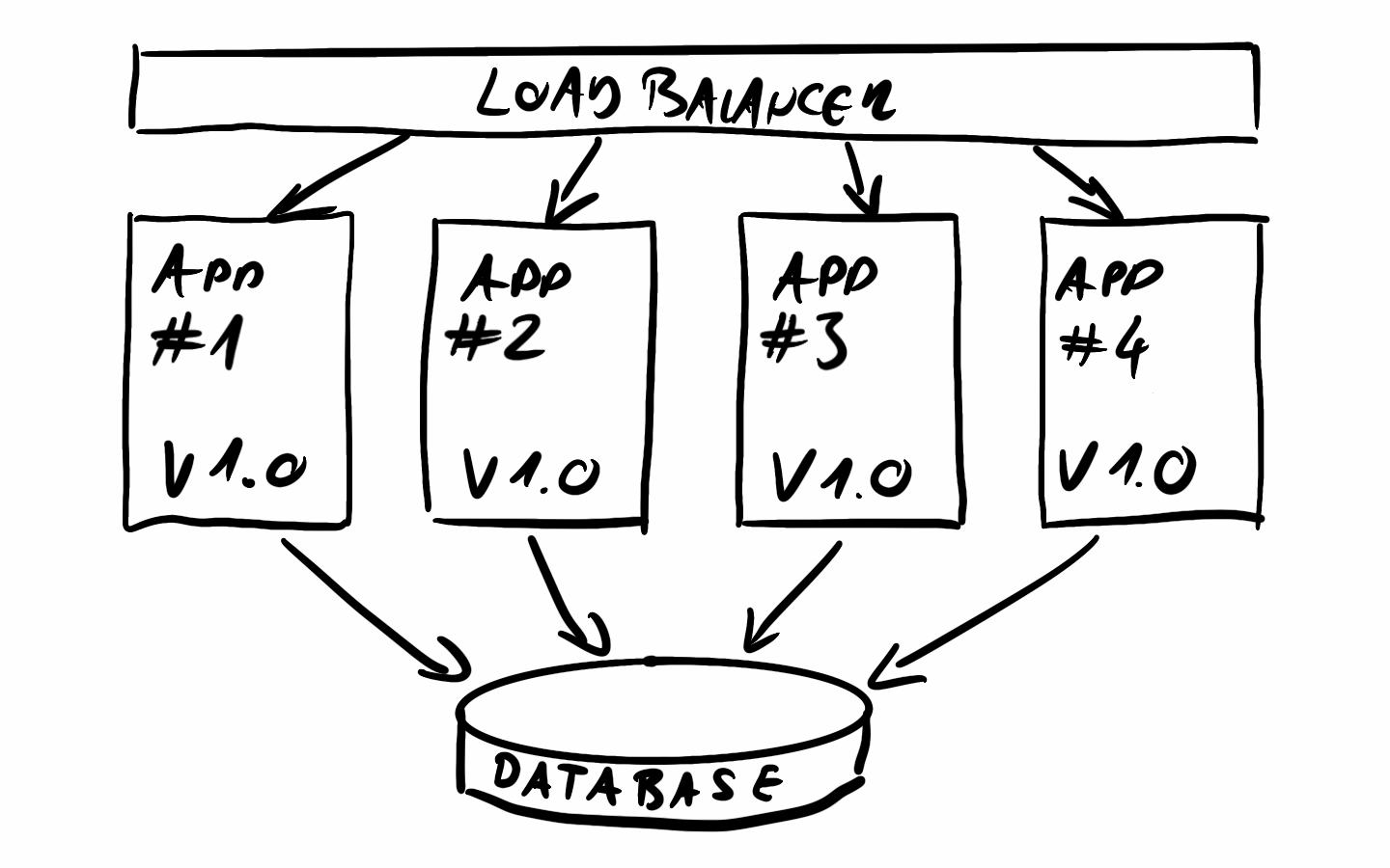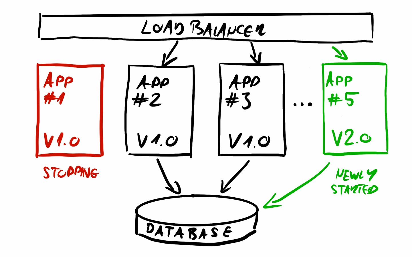 In setups like this, new application version releases are usually executed using rolling update, meaning new instances are started with the new version, and once a new one is running an old one is getting stopped. This way we keep the number of running instances at the desired amount at all times. This also means that there will be a period - usually, a few minutes, depending on the system - when both the old and new versions of the application are running and serving requests simultaneously. This will prove to be quite a headache later for DB updates.