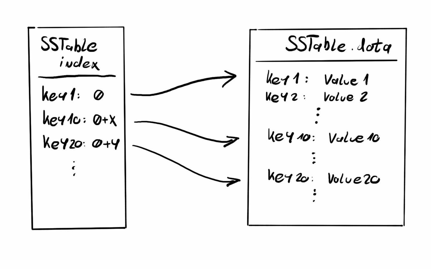 }When adding new and new records and some conditions are met, for example, the memtable gets big enough it will be persisted to permanent storage (HDD, SSD, etc) as an SSTable. This SSTable serialization should create at least 2 files, an index, and a data file. The data file will store the key-value pairs from the memtable keeping the sorted order. The index file will store a sparse index of the keys and their offset in the SSTable. This index will come in handy when we are looking for values and speed up the search.