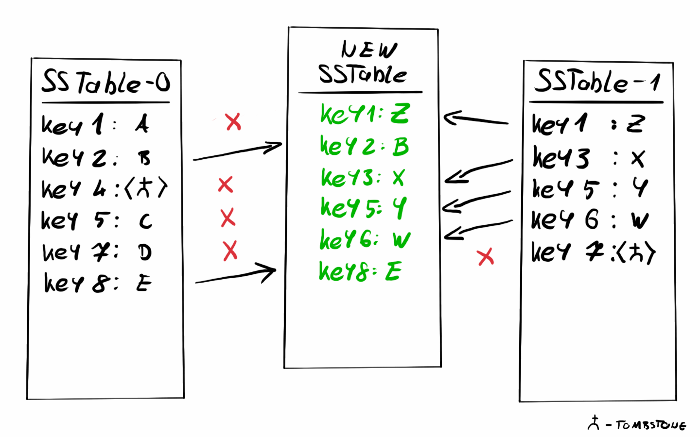 }The merge itself is pretty simple, similar to the last step of a merge sort. If the two values being compared are equal - the keys are the same - we will use the one from the newer SSTable since the most recent value must be used, and older keys should be discarded.