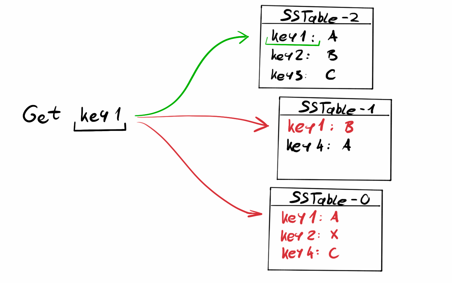 If it was not in the Memtable we have to look at the SSTables. We must have a list of our SSTables in order of creation. By starting with the most recent SStable we can look at its index and check if the key we are looking for is there. If not we can go to the next SSTable and repeat.