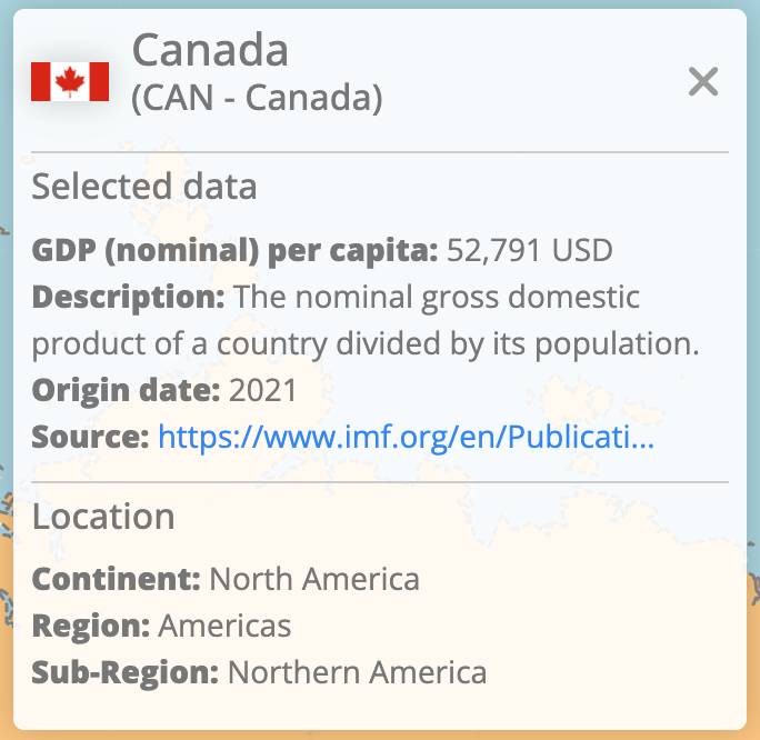 If you click a country an infobox will open in the top right corner. This displays the country's official and short name together with its ISO_A3 designation, flag, the value, a description what this data actually measures, information on the data source and origin date and finally location of the country in the means of continent and region.