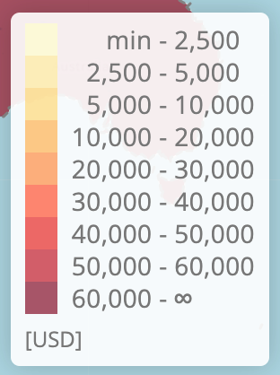 On hover over a country a small tooltip shows the country name and selected value. The legend also highlights the range this hovered value falls into.